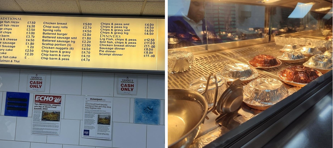 This place had the best fish and chips by far during our 3 week UK vacation. It was fresh, crispy, flavourful and plentiful. Their curry sauce was amazing too. Portions were huge! We went there twice during our 5 day stay in Liverpool. This Canadian thanks you. Highly recommend!